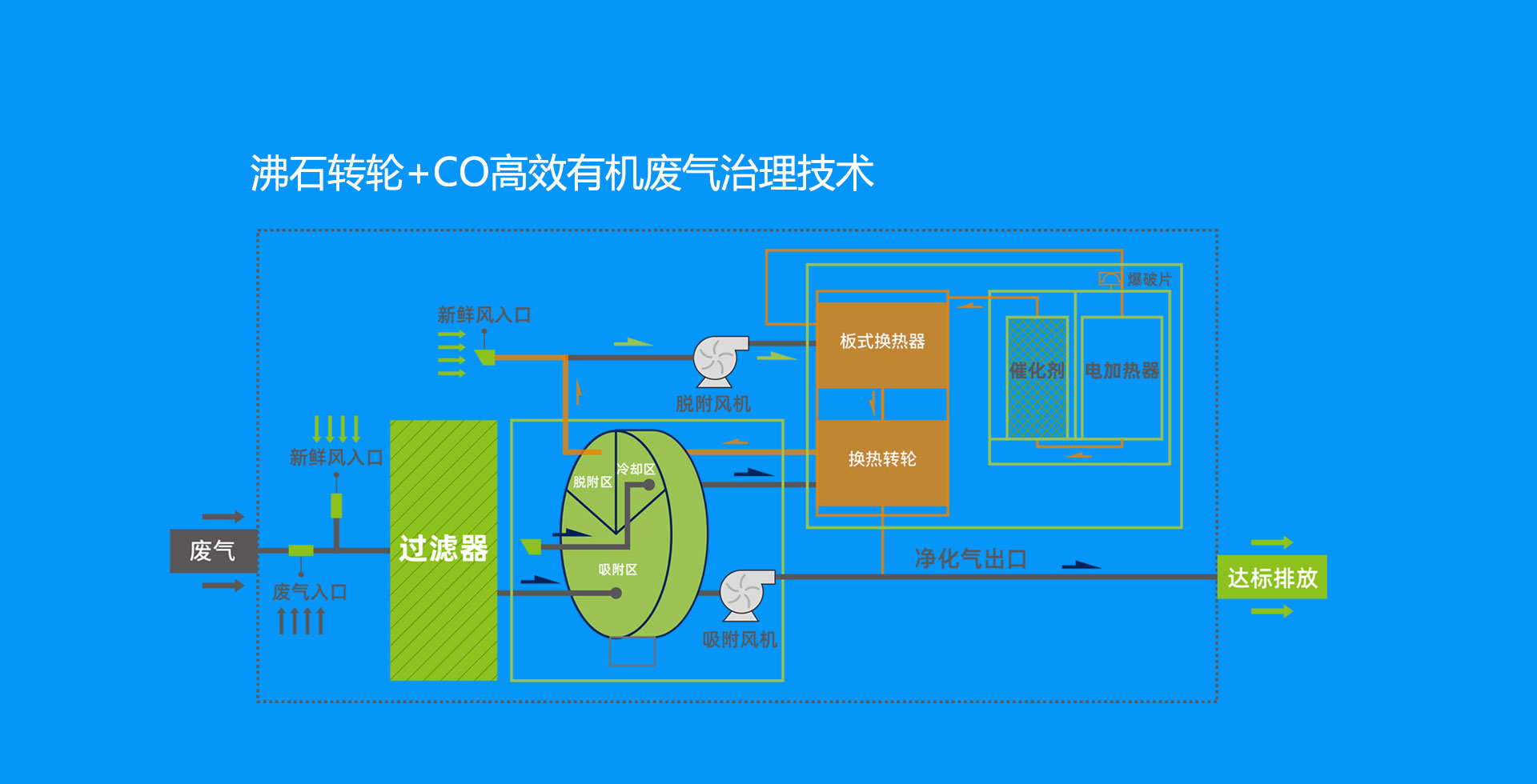 大風(fēng)量、低濃度的有機廢氣的高效治理技術(shù),適用于連續(xù)運行,降低設(shè)備投資及運維能耗。